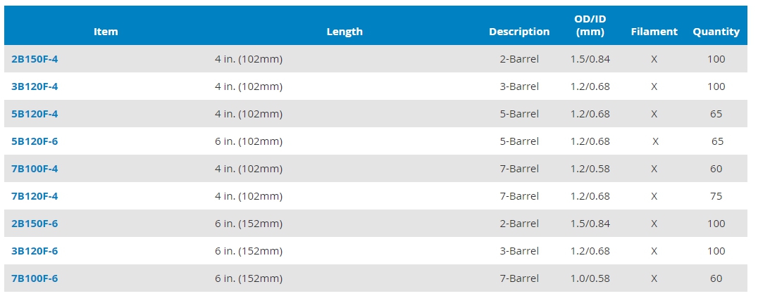 ◆0.5 µm和更小的ID微量移液器包括內部玻璃纖維,易於填充
